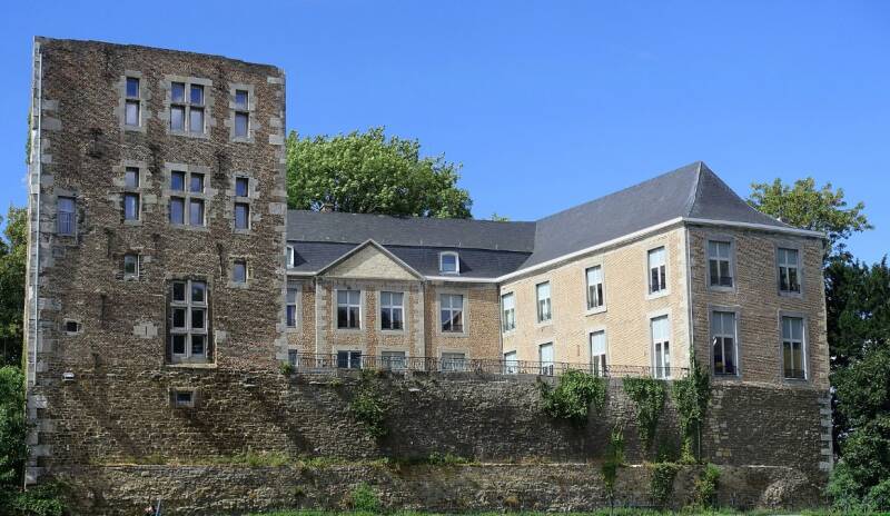 Het kasteel van Oupeye met linbks de middeleeuwse don,jon.