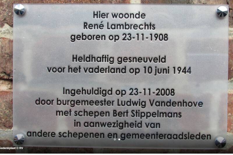 Naar aanleiding van de 100ste verjaardag van René Lambrechts in 2008 werd ook in Sint-Truiden een gedenkplaat onthuld aan het huis waar René Lambrechts indertijd woonde. Maar onverlaten hebben 10 jaar later, in 2018, deze plaat gestolen. Ter ere van de 75ste verjaardag van de inval op de gevangenis en de dood van René heeft het buurtcomité van de René Lambrechtsstraat het initiatief genomen om een replica van de gestolen gedenkplaat te laten maken en ze weer aan de woning te bevestigen.